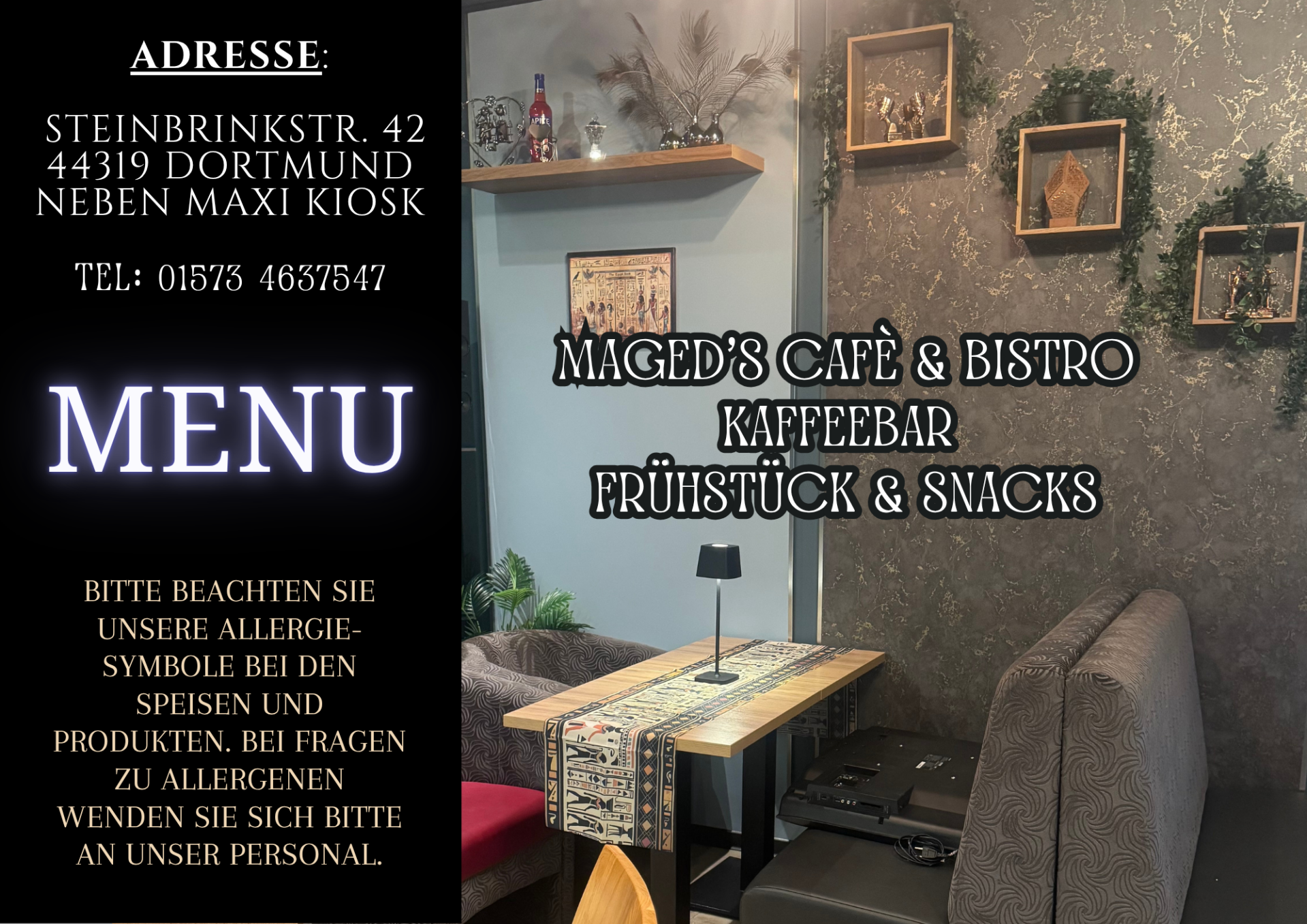 Mageds Bistro Cafê ist ein gemütlicher Ort, an dem man sich sofort willkommen fühlt. Die angenehme Atmosphäre, der freundliche Service und leckeren Speisen machen jeden Besuch besonders. Ob für einen Kaffee zwischendurch oder ein entspanntes Essen- hier spürt man Gastfreundschaft und Qualität. "