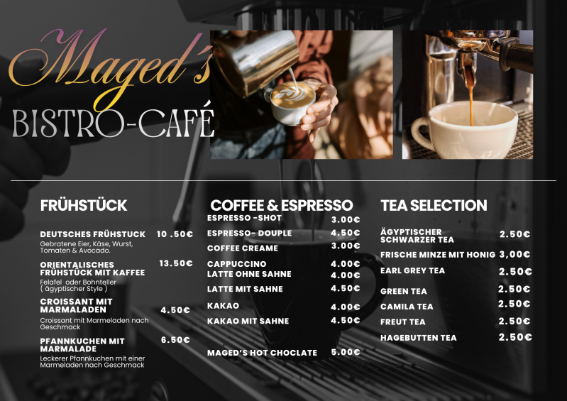 Bei Maged's Bistro- Café legen wir Wert auf frische Zutaten, liebevolle Zubereitung und eine gemütliche Atmosphäre. Wir sind stolz darauf, ein Ort zu sein, an dem Sie sich wohlfühlen und genießen können. Entdecken Sie unsere Leidenschaft für gutes Essen und Gastfreundschaft.